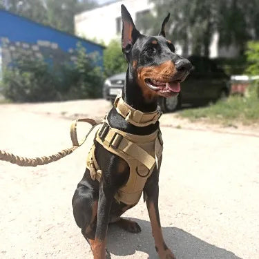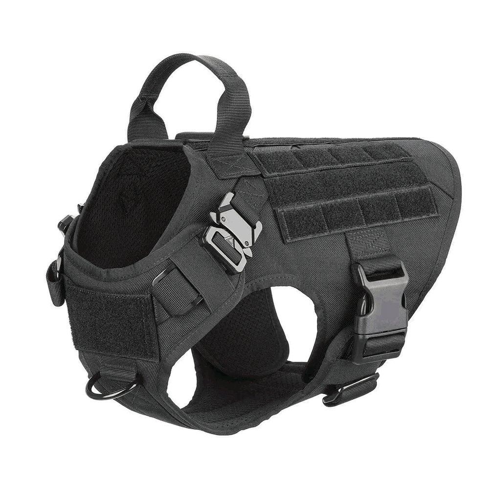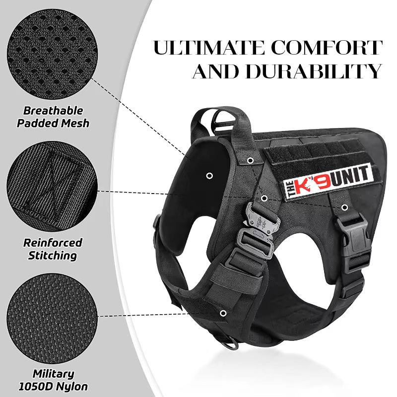 Designed with military-grade materials, adjustable straps, and a no-pull handle, it ensures secure handling while allowing your dog to move freely.